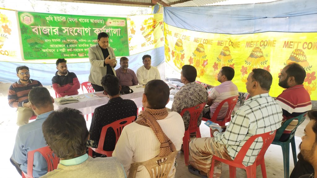নাচোলে বাজার সংযোগ কর্মশালা চাঁপাইনবাবগঞ্জের নাচোল উপজেলার মল্লিকপুর বাজারে প্রয়াস মানবিক উন্নয়ন সোসাইটির কৃষি ইউনিট (মৎস্য খাত)’র আওতায় বাজার সংযোগ কর্মশালা অনুষ্ঠিত হয়েছে। ১৯ ফেব্রুয়ারি সকালে মল্লিকপুর বাজারে কর্মশালায় প্রধান অতিথির বক্তব্য দেন গোমস্তাপুর উপজেলা সহকারী মৎস্য অফিসার আনোয়ার আলী। কর্মশালায় সভাপতিত্ব করেন প্রয়াস মানবিক উন্নয়ন সোসাইটির কনিষ্ঠ সহকারি পরিচালক ও কৃষি ইউনিটের ফোকাল পার্সন ফারুক আহমেদ। বাজার সংযোগ কর্মশালায় ফরোয়ার্ড লিংকেজ ( মাছ উৎপাদন থেকে আহরণের পূর্ব পর্যন্ত) এবং ব্যাকোয়ার্ড লিংকেজ মাছ আহরণ থেকে শুরু করে ভোক্তা পর্যায়ে পৌঁছানোর ব্যবস্থা বিষয়ে আলোচনা করা হয়। এসময় উপস্থিত ছিলেন প্রয়াসের প্রানিসম্পদ কর্মকর্তা ডা. রাজিন বিন রেজাউল, কৃষি কর্মকর্তা কৃষিবিদ মোস্তাফিজুর রহমান, মৎস্য কর্মকর্তা আব্দুর রাজ্জাক, ইউনিট-১১ ব্যবস্থাপক আনোয়ার হোসেন, অফিসার শাহরিয়ার শিমুল ও জামাল উদ্দিন, সহকারী কৃষি কর্মকর্তা সিফাত উল্লাহসহ অন্যরা। এসময় মাছের আড়ৎদার, মাছচাষী, মাছ বিক্রেতা, ফরিয়া, মহাজন, পোনা ব্যবসায়ীরা উপস্থিত ছিলেন। পল্লী কর্ম-সহায়ক ফাউন্ডেশন (পিকেএসএফ)’র সহযোগিতায় কর্মশালার আয়োজন করে প্রয়াস মানবিক উন্নয়ন সোসাইটি। অনুষ্ঠানটির মিডিয়া পার্টনার দৈনিক গৌড় বাংলা ও রেডিও মহানন্দা ৯৮.৮ এফএম।