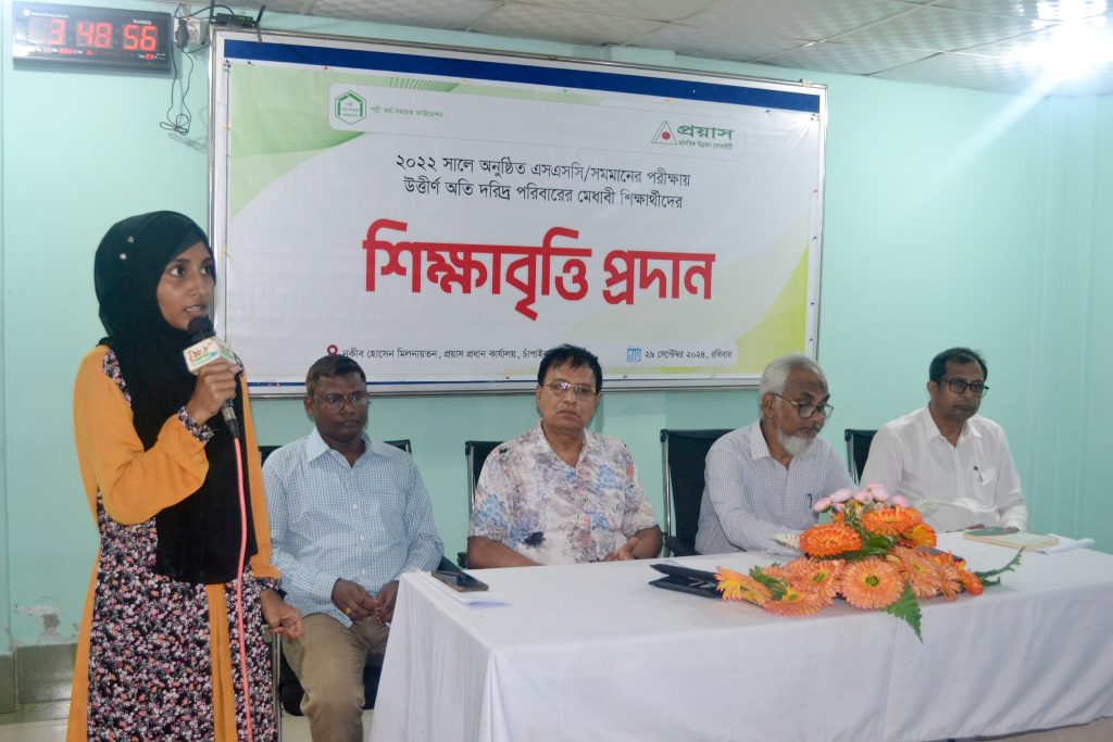 বিশ শিক্ষার্থীকে ১২ হাজার টাকা করে শিক্ষাবৃত্তি দিল প্রয়াস চাঁপাইনবাবগঞ্জে ২০২২ সালের এসএসসি পরীক্ষায় উত্তীর্ণ অতিদরিদ্র পরিবারের মেধাবী শিক্ষার্থীদের মধ্যে শিক্ষাবৃত্তির চেক বিতরণ করা হয়েছে। এ উপলক্ষে রবিবার বিকেলে জেলাশহরের বেলেপুকুরে প্রয়াস মানবিক উন্নয়ন সোসাইটির নকীব হোসেন মিলনায়তনে শিক্ষাবৃত্তির চেক বিতরণ অনুষ্ঠানের আয়োজন করা হয়। প্রয়াসের প্রতিষ্ঠাতা ও নির্বাহী পরিচালক হাসিব হোসেনের সভাপতিত্বে অনুষ্ঠানে প্রধান অতিথির বক্তব্য দেন- জেলা শিক্ষা অফিসার আবদুর রশিদ। বিশেষ অতিথির বক্তব্য দেন- প্রয়াস মানবিক উন্নয়ন সোসাইটির পরিচালক পঙ্কজ কুমার সরকার। প্রধান অতিথির বক্তব্যে আবদুর রশিদ শিক্ষার্থীদের উদ্দেশ্যে বলেন, তোমাদের ভালো করে লেখাপড়া করতে হবে। তোমরা এখান থেকে বৃত্তির যে টাকা পেলে, সেটা লেখাপড়ার কাজে ব্যয় করবে। তিনি বলেন, বর্তমানে আমরা চাঁপাইনবাবগঞ্জের মানুষ লেখপড়ায় পিছিয়ে যাচ্ছি। গত কয়েকবছর আগে রাজশাহীতে অনেক ছাত্রছাত্রী পড়ালেখা করতে যেত, এখন তা অনেক কমে গেছে। তিনি উপস্থিত শিক্ষার্থীদের বলেন, লেখাপড়ার কোনো বিকল্প নেই। তোমরা বড় স্বপ্ন দেখবে এবং তা বাস্তবায়নের জন্য কঠোর অনুশীলন করবে। জেলা শিক্ষা অফিসার বলেন, তোমাদের কাছে যে মোবাইল আছে, সেটার ভালো ব্যবহার করবা। তোমাদের একটাই উদ্দেশ্য হওয়া উচিত যে, তোমরা তোমাদের মা-বাবার মুখ উজ্জ্বল করবে। সভাপতির বক্তব্যে প্রয়াসের প্রতিষ্ঠাতা ও নির্বাহী পরিচালক হাসিব হোসেন বলেন, আমরা আমাদের বাবা-মাকে যেমন সম্মান দেখাব, তেমনিভাবে আমাদের শিক্ষকদেরকেও সম্মান দেখাব। আসুন, আমরা মানুষের মতো মানুষ হয়ে দেখাই। তিনি বলেন, আমরা আমাদের নিজের, পরিবারের, সমাজের ও রাষ্ট্রের জন্য কাজ করব। তিনি আরো বলেন, নিজেকে পিছিয়ে রাখলে পেছনে যেতে হবে, নিজেকে সামনের দিকে এগিয়ে নিয়ে যেতে চাইলে, এগিয়ে নিয়ে যাওয়া যাবে। হাসিব হোসেন বলেন, আপনি আমি আমরা সবাই মৃত্যুবরণ করব। কিন্তু আমার আপনার কর্ম বেঁচে থাকবে, এই প্রয়াস বেঁচে থাকবে এবং মানুষের কল্যাণে কাজ করবে। আশা রাখি, আমরা সফল হবো এবং আগামীদিনে আমাদের যে পরবর্তী জেনারেশন আসছে, তার জন্য কাজ করব। তিনি আরো বলেন, আমরা একে অপরকে সম্মান জানাব, একে অপরের কথা শুনব, একে অপরকে সহ্য করব এগুলো যদি আমরা করতে পারি তাহলে আমাদের মধ্যে মানবিক মূল্যবোধগুলো সৃষ্টি হবে। তাই আমাদের ব্যক্তির থেকে যে বিষয়গুলো বড় করে দেখা উচিত, সেগুলো দেখব। হাসিব হোসেন বলেন, আপনারা যেমন চাঁপাইনবাবঞ্জে জন্ম নিয়ে সারা বাংলাদেশে সৌরভ ছড়াবেন, তেমনি প্রয়াস চাঁপাইনবাবগঞ্জে জন্ম নিয়ে সারা বাংলাদেশে সৌরভ ছড়াচ্ছে। সভা সঞ্চালনা করেন প্রয়াসের কনিষ্ঠ সহকারী পরিচালক মু. তাকিউ
