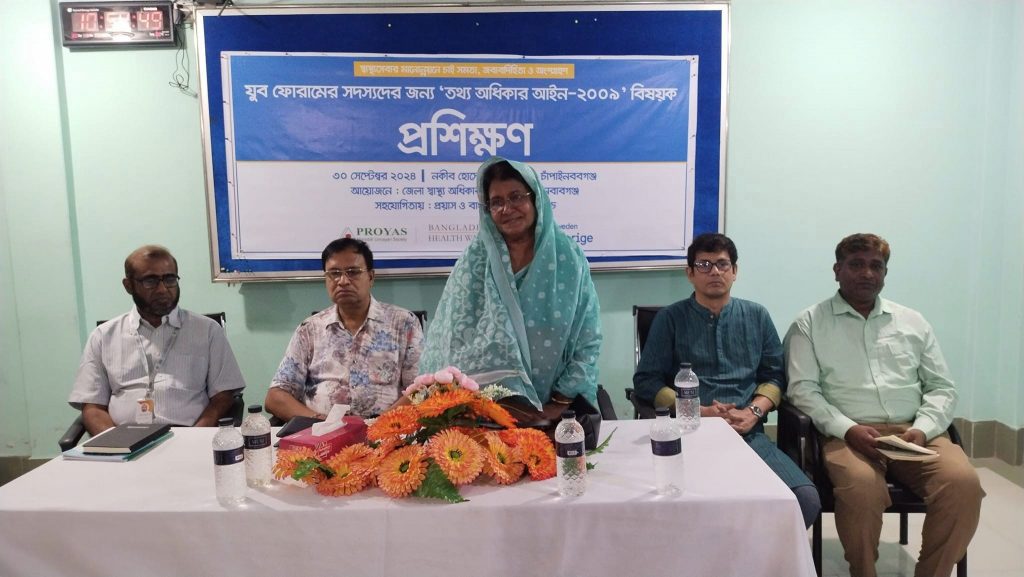 ‘স্বাস্থ্যসেবার মানোন্নয়নে চাই সমতা, জবাবদিহিতা ও অংশগ্রহণ’- এই প্রতিপাদ্যে কাজ করছে চাঁপাইনবাবগঞ্জ জেলা ও নাচোল উপজেলা স্বাস্থ্য অধিকার যুব ফোরাম। এ দুটি ফোরামের সদস্যদের নিয়ে তথ্য অধিকার আইন-২০০৯ বিষয়ক প্রশিক্ষণ সোমবার সকালে জেলাশহরের বেলেপুকুরে প্রয়াস মানবিক উন্নয়ন সোসাইটির প্রধান কার্যালয়ের নকীব হোসেন মিলনায়তনে অনুষ্ঠিত হয়। প্রশিক্ষণের শুভ উদ্বোধন ঘোষণা করেন নবাবগঞ্জ সরকারি কলেজের অবসরপ্রাপ্ত অধ্যক্ষ ও জেলা স্বাস্থ্য অধিকার ফোরামের সভাপতি প্রফেসর সুলতানা রাজিয়া। সভায় সূচনা বক্তব্য দেন- প্রয়াসের প্রতিষ্ঠাতা ও নির্বাহী পরিচালক এবং জেলা স্বাস্থ্য অধিকার ফোরামের সাধারণ সম্পাদক হাসিব হোসেন। প্রশিক্ষণ প্রদান করেন বাংলাদেশ হেলথ ওয়াচের প্রোগ্রাম ডিরেক্টর শেখ মাসুদুল আলম ও প্রোগ্রাম ম্যানেজার মোরশেদ আলম। এসময় উপস্থিত ছিলেন- স্বাস্থ্য অধিকার ফোরামের চাঁপাইনবাবগঞ্জের ফোকালপার্সন ও প্রয়াসের কনিষ্ঠ সহকারী পরিচালক ফারুক আহমেদ, আরএমটিপি প্রকল্পের প্রকল্প ব্যবস্থাপক রিফাত আমিন হিরা, প্রয়াসের অফিসার শাহরিয়ার শিমুল, সহকারী প্রাণিসম্পদ কর্মকর্তা ইমদাদুল হক। উল্লেখ্য, স্থানীয় পর্যায়ে স্বাস্থ্য অধিকার ও স্বাস্থ্যসেবার মানোন্নয়নে জনসচেতনতা সৃষ্টি, স্বচ্ছতা তৈরি, জবাবদিহিতা বৃদ্ধি এবং সকল পর্যায়ে জনঅংশগ্রহণ নিশ্চিত করে স্বাস্থ্যসেবা খাতে টেকসই উন্নয়ন সহায়ক পরিবেশ সৃষ্টির লক্ষে কাজ করছে চাঁপাইনবাবগঞ্জ জেলা ও নাচোল উপজেলা স্বাস্থ্য অধিকার ফোরাম এবং যুব ফোরাম। এতে সহযোগিতা করছে বাংলাদেশ হেলথ ওয়াচ ও প্রয়াস মানবিক উন্নয়ন সোসাইটি।