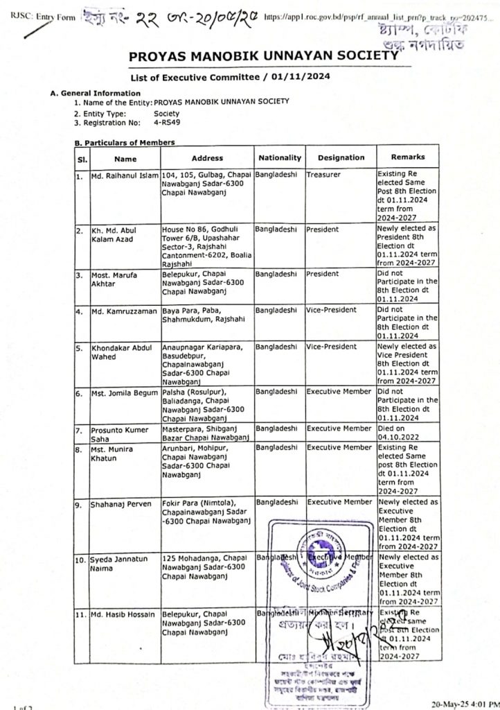 2. Position: Member Secretary at Proyas Manobik Unnoyon Society